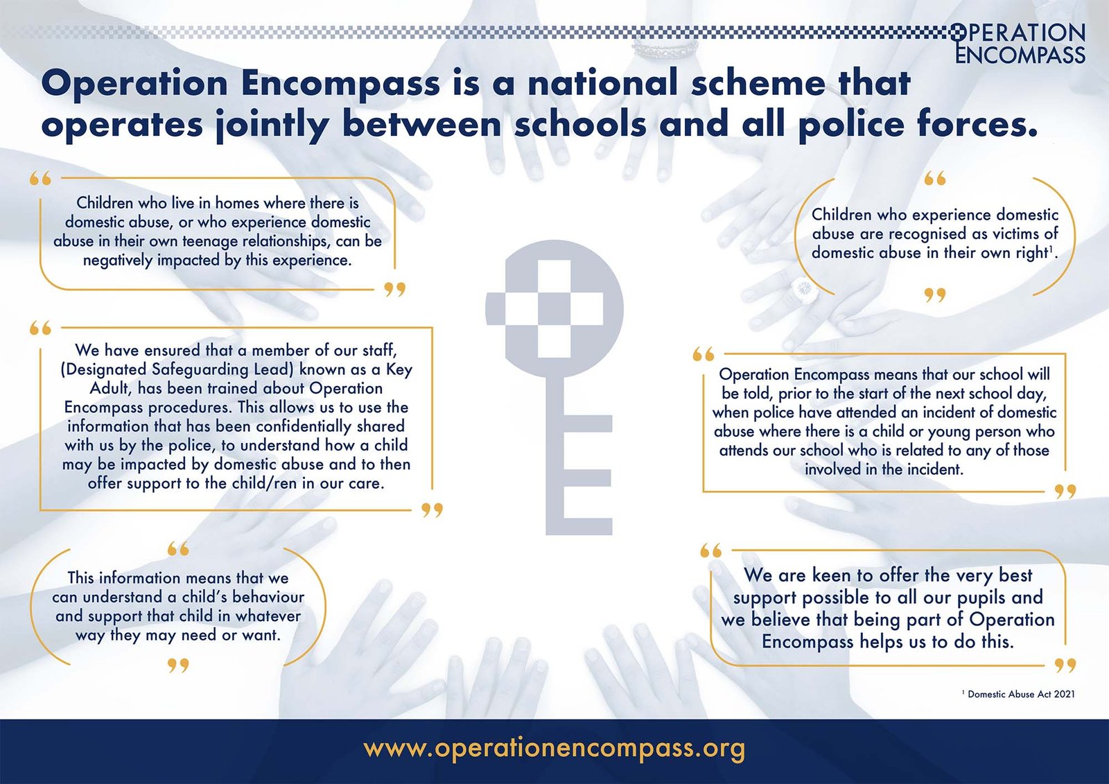 Operation Encompass is a UK-wide partnership between police forces and schools to provide early help and support for children who have experienced domestic abuse. The scheme involves police forces notifying designated safeguarding leads at schools about domestic abuse incidents before the school day starts, enabling immediate support for affected children.